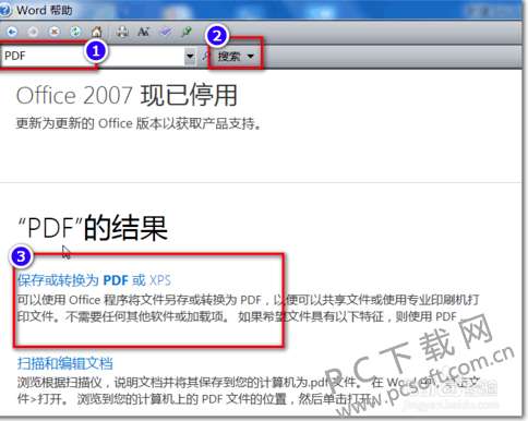 2、然后会打开Word帮助窗口,在帮助窗口中的搜索框输入PDF关键词,点击后点击搜索选项,在下方的搜索结果中点击保存或转换为PDF或XPS。