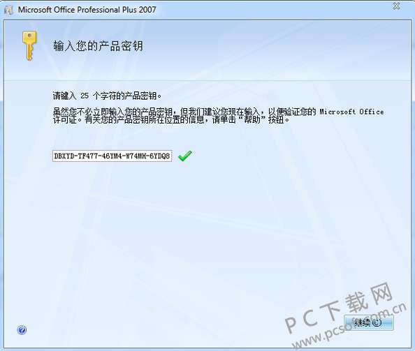 2、输入office2007产品秘钥,输入完成后点击【继续】按钮。