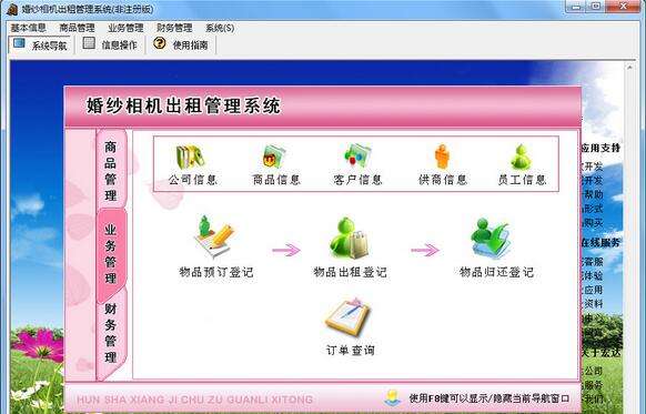 婚纱相机出租管理系统电脑版是款主要应用于一些从事婚纱相机租借的商铺研发设计的管理工具,婚纱相机出租管理系统电脑版用途十分广泛,操作十分简单,主要适用于婚纱相机出租公司、婚纱摄影店等场所,婚纱相机出租管理系统可以帮助该行业的人节省工作时间和提高工作效率。