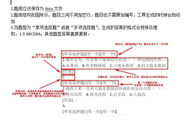 1.用户可以用word编辑题库,题库按照指定要求的格式填写,题库可以区分题型,章,小节。
