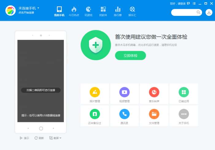 1、点击电脑桌面上的360手机管家官方版,登录账号,进入360手机助手主页。