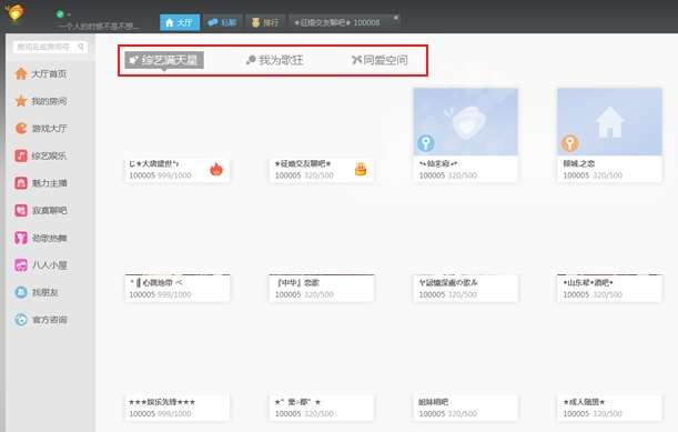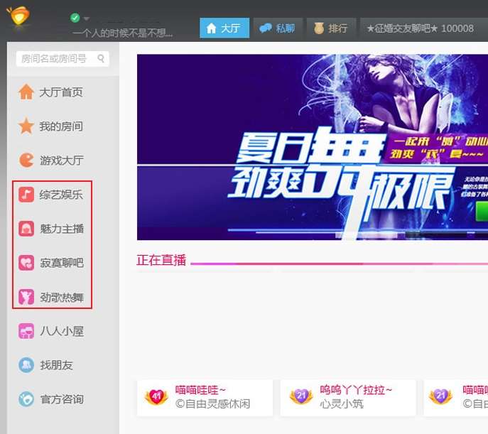 b.在综艺娱乐、魅力主播、寂寞聊吧、劲歌热舞四个主要频道中你还可以选择细分频道,查看每个频道不同的房间,点击房间的图片就直接进入房间喽(*∩_∩*)。