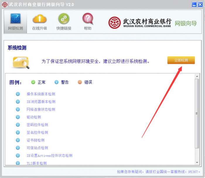 武汉农村商业银行网银向导官方版能够帮助用户配置网银使用环境。武汉农村商业银行网银向导提供了全面的网银配置功能,一键帮助用户解决使用问题,不再为使用网银时的各种问题困扰。