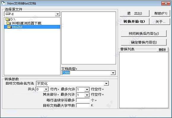 html文件转txt文档是一款非常好用的html文件转换txt软件,该软件可以帮助你将html、htm等网页格式文档格式转换txt文本格式,而且还支持转换参数调节,可以设置空行和最大字数,非常的好用。