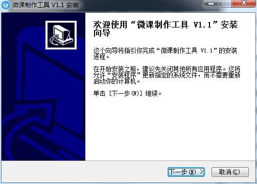 1、在PC下载网将微课制作工具下载下来,并加压到当前文件夹中,然后点击其中的muke_1.1.exe应用程序,进入安装向导界面,点击下一步。