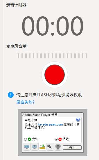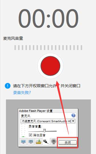 4、点击红色录音按钮开始进行录制,录制结束后,点击红色停止录音按钮。【注意】录音之前一定要点击flash设置的关闭按钮。
