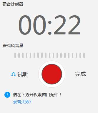 2、打开录音功能,需要能看到权限窗口。(如果未出现窗口,请 确保浏览器拥有环境,等待几秒)