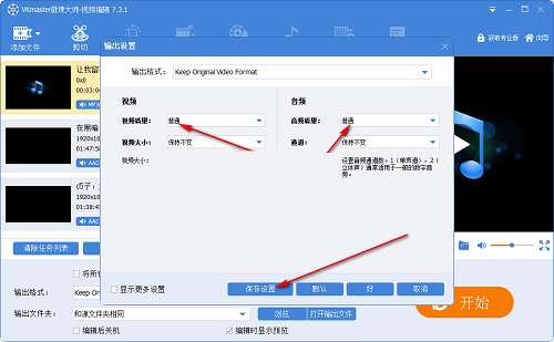 8、输出设置,用户点击软件下方的输出设置,设置想要输出的视频质量以及音频质量,点击保存设置即可