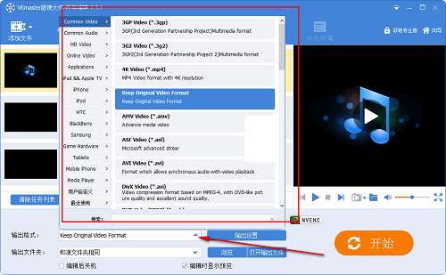 2.点击“添加文件”添加需要编辑的视频,再点击“输出设置”,选择需要的输出格式,如下图: