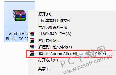 1、首先从PC下载网下载安装包,右击软件包选择“解压到“Adobe After Effects CC 2018””。