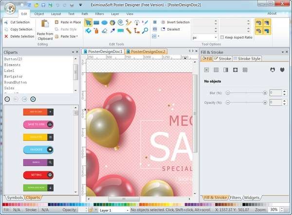 EximiousSoft 海报设计器包含2000 多个具有高级质量的纯矢量格式模板。模板中的所有元素都可以根据需要自由编辑和替换。在每个设计的开始,您可以选择最匹配目标设计的模板作为草稿,或者从头开始您自己的设计过程。海报程序还包含5000 多个矢量符号和1000多个剪贴画和其他设计素材。这些材料可以根据需要随时通过拖放的方式添加到作品中。设计好的海报可以导出为PDF, SVG , SVGZ , PS, PNG , TIFF , JPG , BMP等图形或图像,也可以在本地打印机上 100% 不失真地打印。