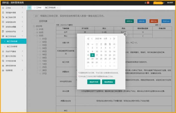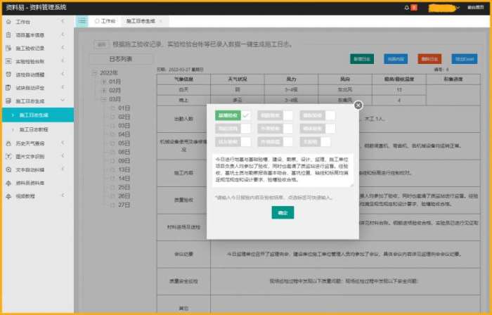 资料易施工日志自动生成软件可根据工程地址自动填写施工日志的气象信息,根据施工验收记录、实验检验台帐等已录入数据自动添加施工日志的各项内容,支持一键生成施工日志,一键导出施工日志。