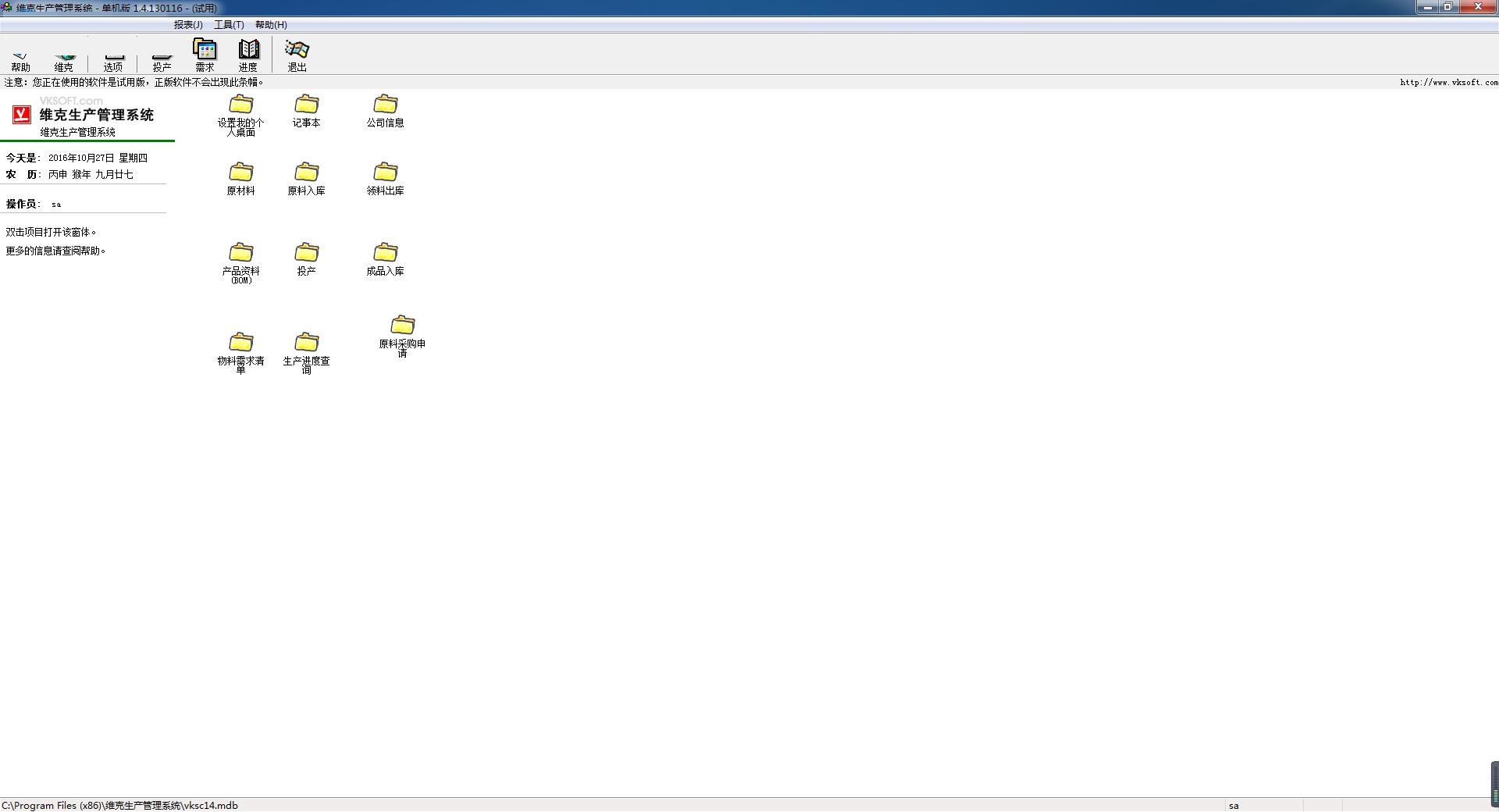 维克生产管理系统官方版是一款十分出色的企业生产管理系统,维克生产管理系统官方版功能丰富全面,支持系统管理,包括公司信息设置、操作员权限、选项、数据初始化,此外维克生产管理系统最新版还支持生产资料管理,包括原材料设置、产品资料及BOM配置等。