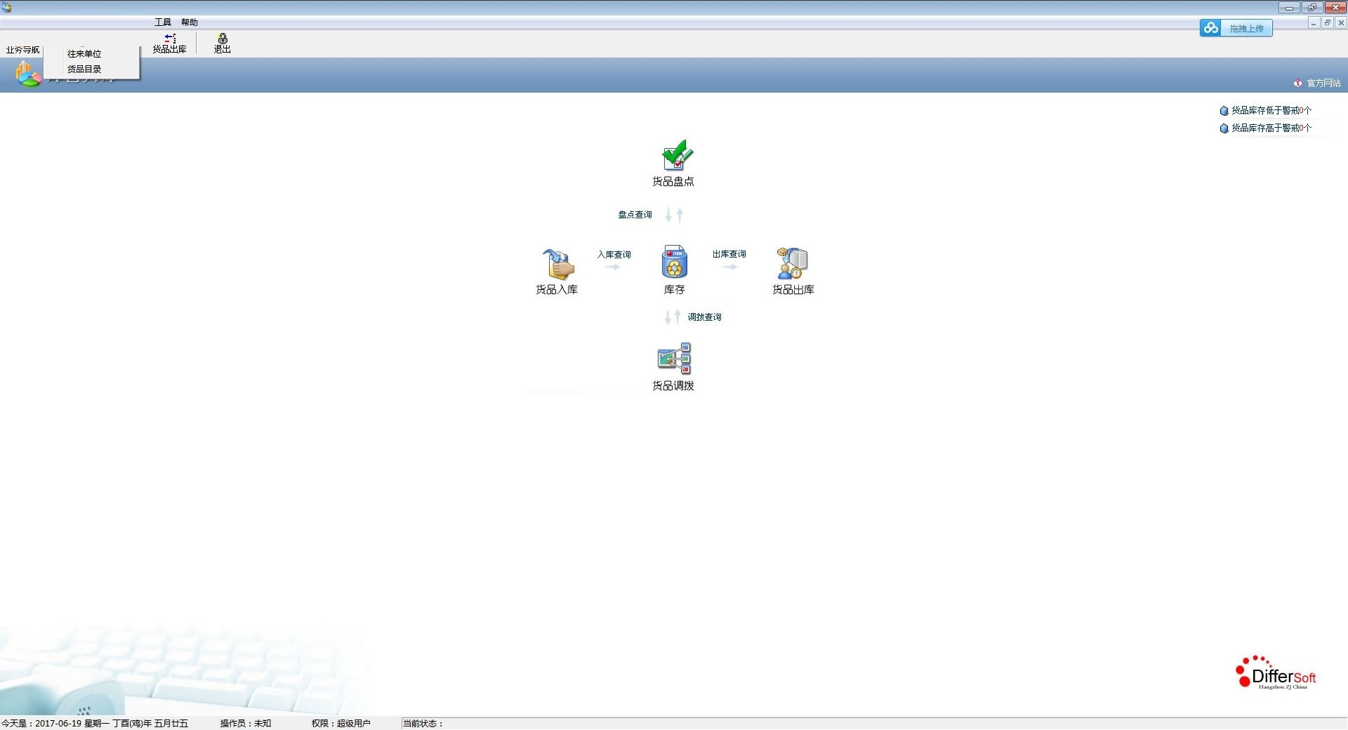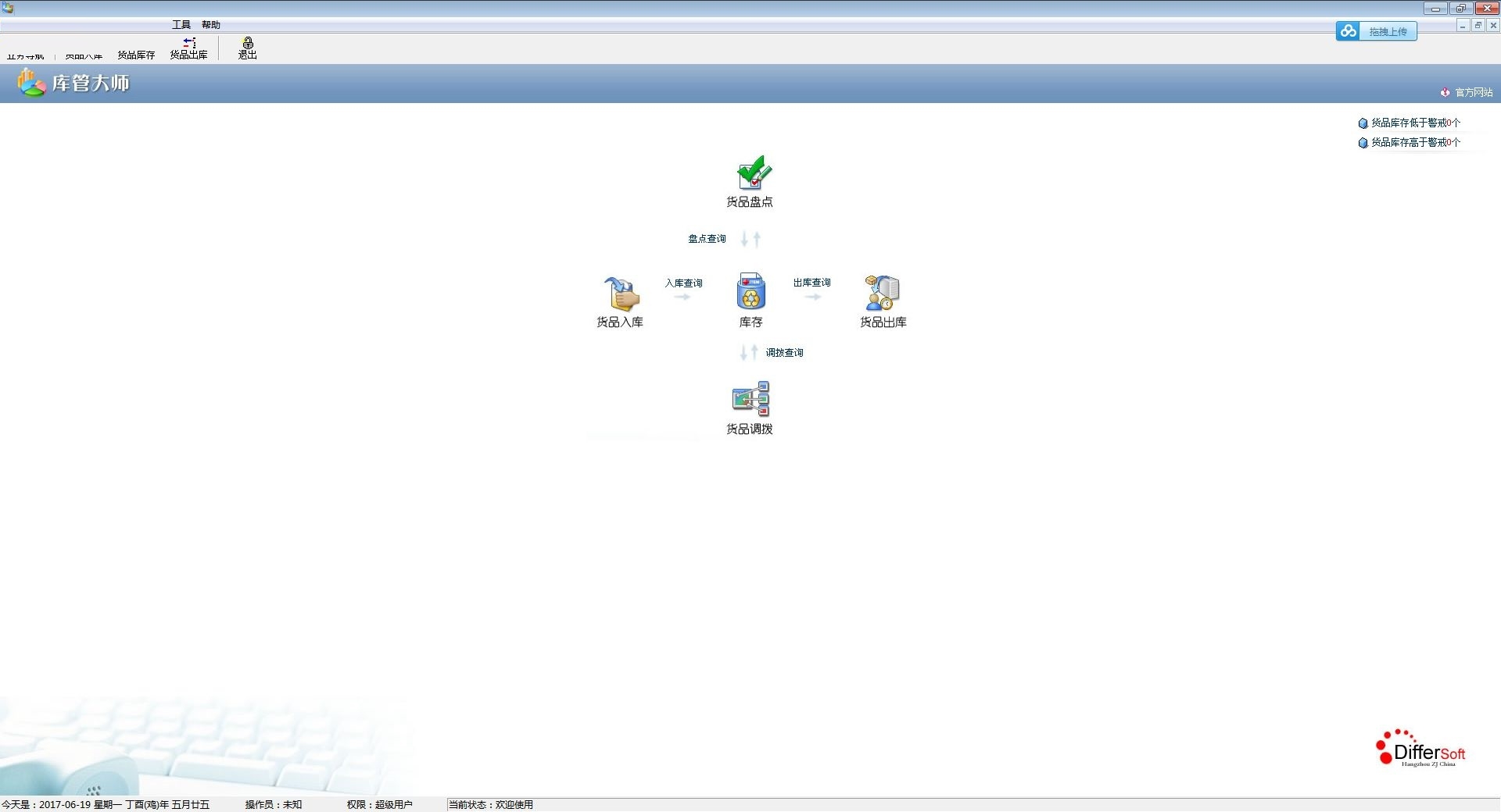 1、进入软件的主界面,出现下图界面,包括了货品盘点、盘点查询、入库查询、出库查询、货品出库、货品调拨等;