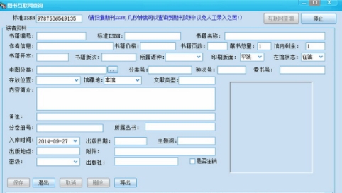 本软件适合图书馆对大量图书信息的录入,减少了手工录入的麻烦,录入书籍资料时直接扫描书后面自带的ISBN或者ISSN条码号,软件即可从网上搜索相应书籍名称,书籍类型,出版社,价格,内容简介等相关信息,同时还自动生成中图分类名称,中图分类号,自动生成种次号,索书号!避免繁琐的手工录入!