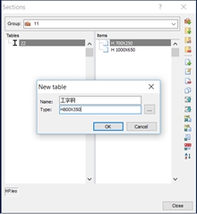 2. 在右侧框选区域点击第二个工具New table来添加一个新的截面类型及截面名称,比如H型钢,角钢,槽钢等;