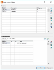 第二步,切换到Load conditions栏中,点击Add/Edit,在Cases对话框中使用回车键完成添加荷载工况的添加,在Combinations对话框中通过键入组合公式或者Generate工具来完成组合工况的添加;