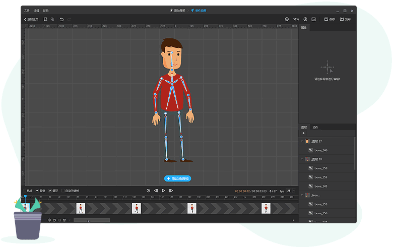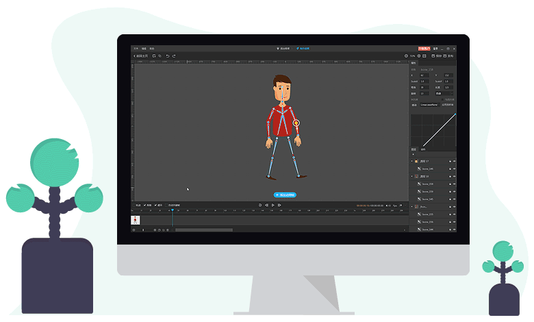 添加骨骼到图片后,可以控制骨骼让角色移动、任意角度旋转。其中曲线骨骼可以让角色的曲线变化更加圆滑流畅,从而让动画角色整体效果达到最佳。