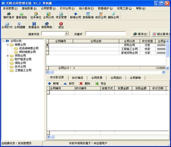 天皓合同管理系统最新版是款非常优秀且相当色的合同管理工具,天皓合同管理系统最新版内置丰富而又实用的功能,简洁的操作界面,且天皓合同管理系统集合同基础信息、合同收付款信息、合同执行信息、合同变更信息、合同违约信息、合同索赔信息、各种数据查询和打印、合同提醒等功能于一体,可以满足用户的需要。