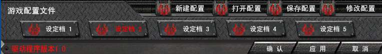 游戏鼠标驱动可将当前鼠标按键配置设定为针对一个游戏的配置文件,配置文件定义完成后可将其保存(建议配置名称与所适合的游戏名相关联)。此驱动程序已配有5个配置文件:配置文件1~配置文件5,其默认路径为驱动安装目录下Config文件包,一一对应当前设定界面上所关联的5个游戏程序。