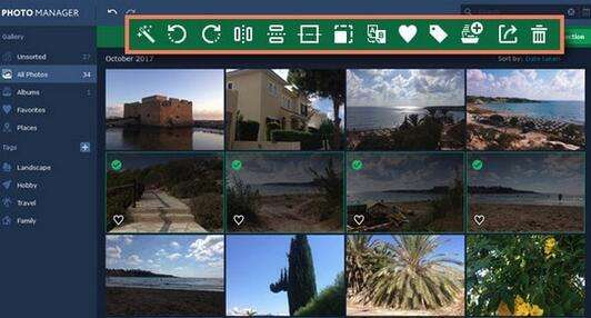 使用Movavi Photo Manager,您可以同时编辑多张照片。为此,请单击要编辑的照片。您将看到绿色面板,窗口顶部显示所有顶部。