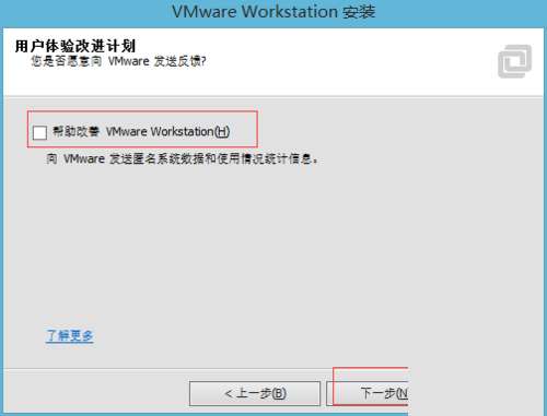 8、用户体验改进计划界面如下所示,不勾选”帮助改善VMware Workstation(H) “,点击”下一步“