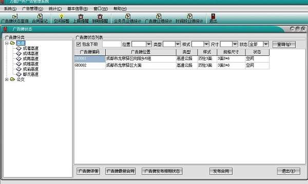万能户外广告管理系统官方版是一款户外广告管理系统。万能户外广告管理系统官方版可以管理户外广告使用状态,用户可以按地域、高速路段、村组等信息来分类,并且查看户外广告的状态,软件将自动计算户外广告使用期限,期限截止则会提醒用户做出相应的处理。万能户外广告管理系统可以管理户外广告顾客的合同。