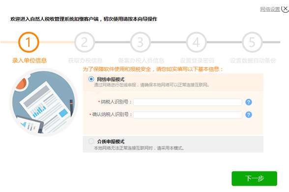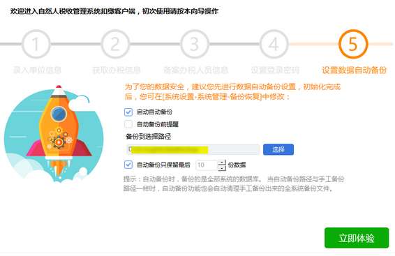 软件安装完成后,点击界面上的【立即体验】按钮(或点击桌面“自然人税收管理系统扣缴客户端”快捷方式),即进入注册流程。注册一共分为五个步骤。