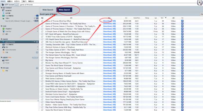 在右上角的搜索框输入想要下载的电影或其他内容,回车确认,点击web search右边的meta search,然后选中要下载的文件,点击download