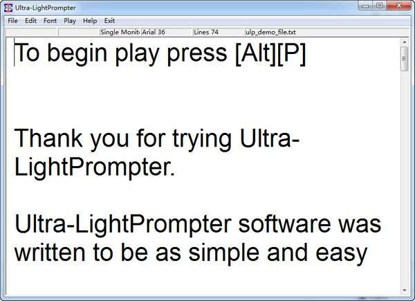 Ultra-LightPrompter(提词器软件)官方版是一款好用的提词器工具。Ultra-LightPrompter(提词器软件)最新版支持xp/win7系统,能够更改文字的大小和提词速度。用户使用Ultra-LightPrompter(提词器软件)官方版时只需要打开要提词的文件,开始运行是按热键ALT+P键即可。