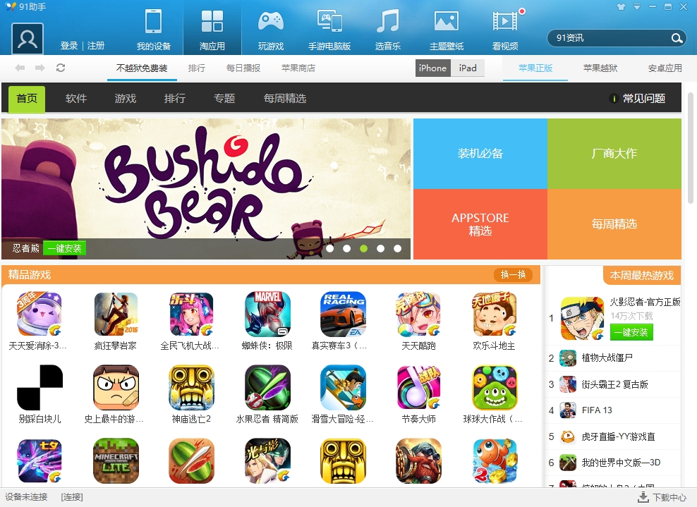 将ipad、iphone等设备用数据线连接电脑,然后打开91手机助手。