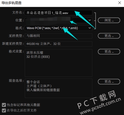 3、在弹出的导出多轨混音设置界面后,你可修改文件的名字、文件保存的位置、文件的格式等,修改完成后点击【确定】就可以了。