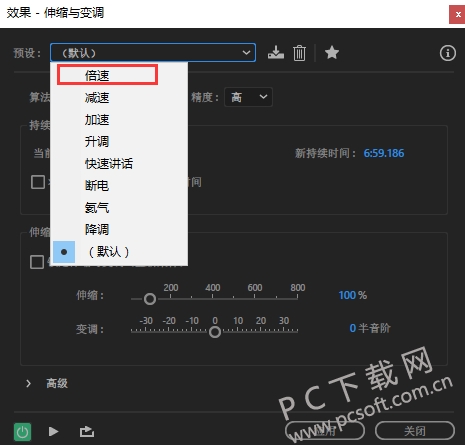 3、在弹出的效果-伸缩与变调设置界面中,将默认的预设调整为“倍数”就可加快音乐速度了。