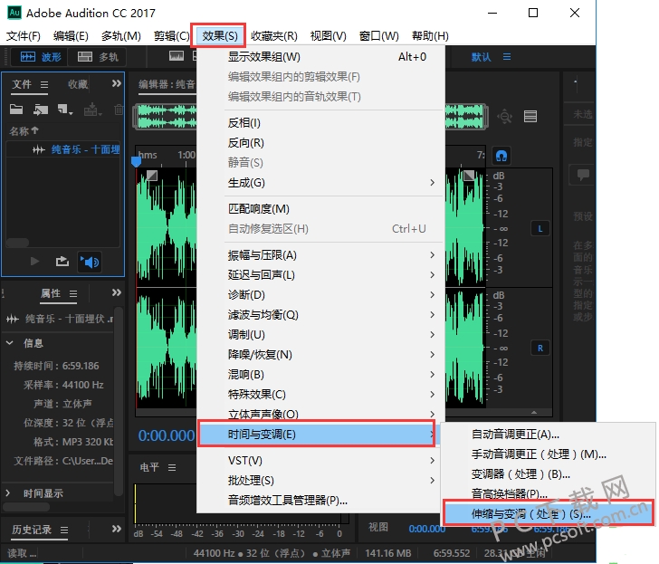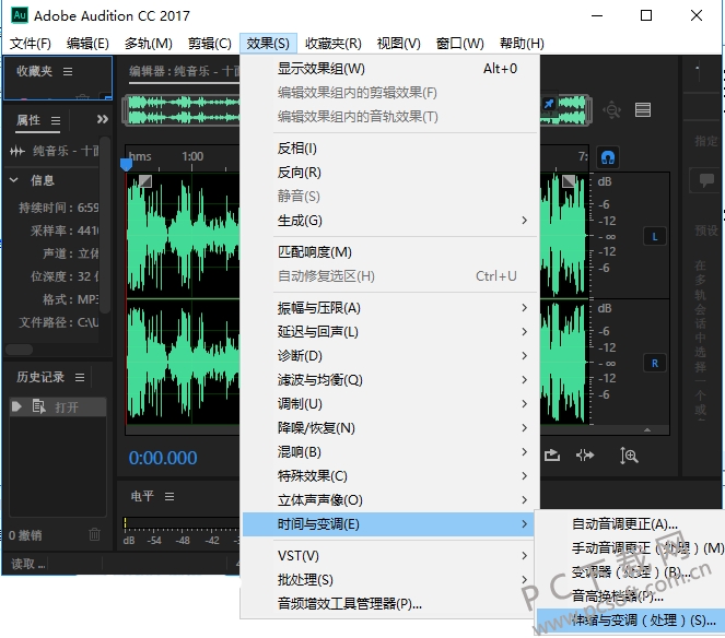 2、导入音乐后,点击顶部的工具栏的“效果”,在弹出的菜单选项中找到“时间与变调”选项并选中,在弹出的选项中找到“伸缩与变调(处理)”并点击。
