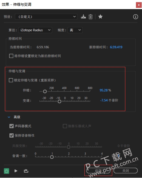 3、在弹出的伸缩与变调(处理)设置框中,可以修改伸缩与变调,调的数字越大代表速度越慢,反之代表速度快。如果您想试听一下效果,您可以点击底部的三角形图标,可以试听一下效果。修改完成点击底部的【应用】。