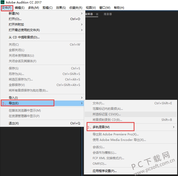 1、打开httpAdobe AuditionCC 2017后,点击顶部的“文件”按钮,然后在弹出的菜单选项中找到“导出”选项并选中,选中后,在弹出的二级菜单中找到“多轨混音”。