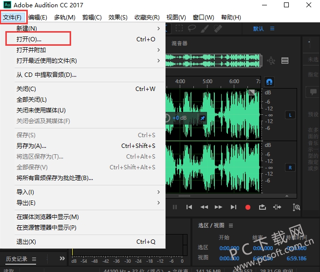 1、打开Audition CC 2017后,点击顶部的“文件”按钮,在弹出的选项中点击“打开”找到您要打开的音乐素材。