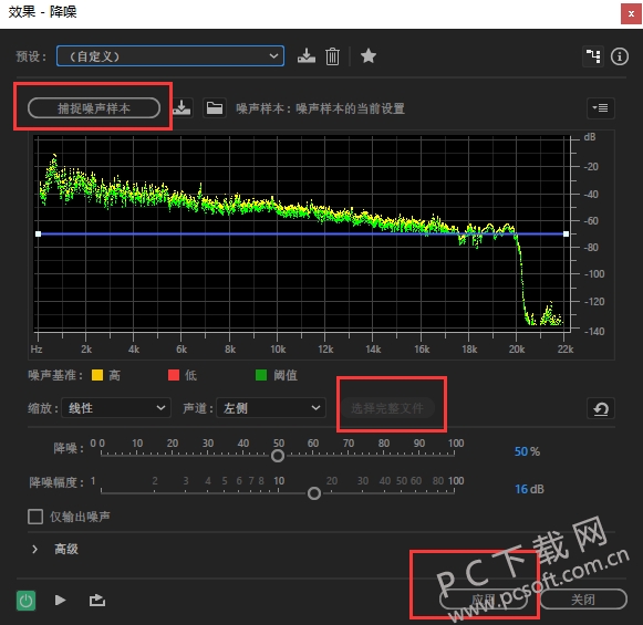 4、在弹出的降噪处理界面中,点击顶部的“捕捉噪声样本”选项,再点击中部的“选择完整文件”,修改完成后点击底部的【应用】就可以对音频进行降噪处理了。