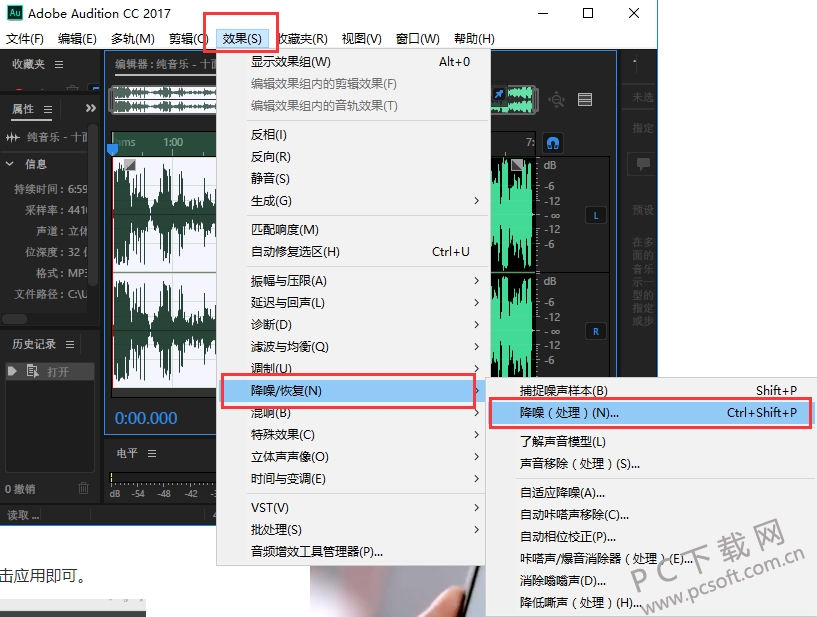 3、选中后,点击顶部的“效果”按钮,在弹出的菜单选项中找到并选中“降噪/恢复”选项,选中“降噪/恢复”选项后,在弹出的二级菜单中找到“降噪(处理)选项”。
