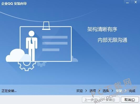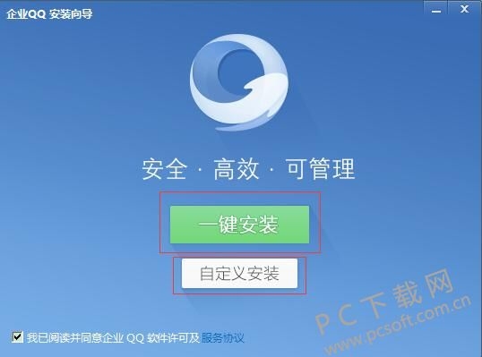 二、进入企业QQ安装主界面后,可以看到有一键安装和自定义安装两个选项,用户可以直接点击一键安装,软件就会安装到默认位置C盘中,或者用户可以点击自定义安装,然后选择想要安装的位置,选择完成后点击安装就可以开始安装了,耐心等待安装进度条完成。(小编建议用户选择自定义安装,将软件安装到其他位置)