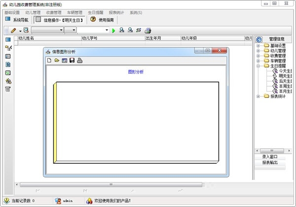 宏达幼儿园收费管理系统中文版是款高效专业且适用范围广泛的中小型幼儿园收费管理软件,宏达幼儿园收费管理系统中文版内置丰富的功能,简洁的操作界面,宏达幼儿园收费管理系统包括基础信息、幼儿管理、收费管理、车辆管理、生日提醒、报表统计等功能模块。