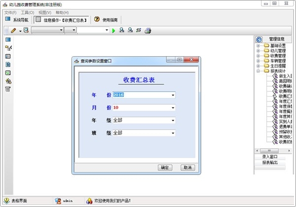 六、报表统计:收费汇总表、收费明细表、收费确认表、年度汇总表、年度退费汇总表、离园明细表、新生入园表