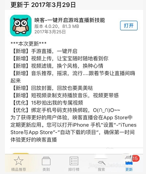 2、为了获得更好的体验,我们会定期更新应用。您可以打开手机”设置“-“iTunes Store与App Store”-”自动下载的项目“,确保第一时间体验更好的映客。