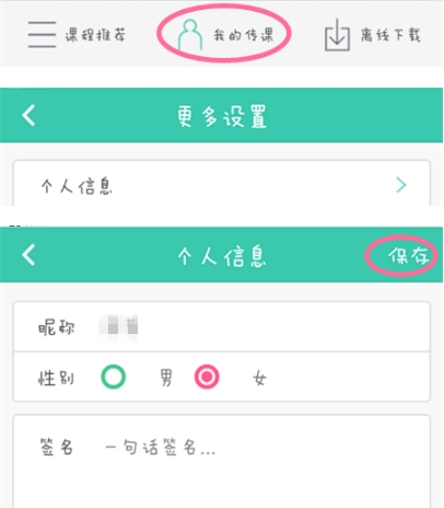 2.登陆后可以修改名称,点击“我的传课”的“个人信息”,修改昵称,点击“保存”。