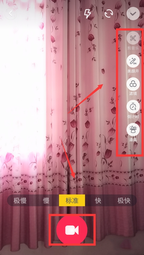 【录制抖音短视频】的页面,长按中间摄像头录制,可以设置视频的快慢和滤镜美颜。
