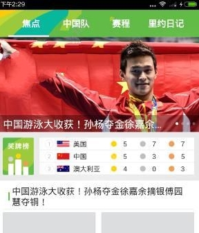 1、打开app,首页有焦点、中国队、赛程和里约日记