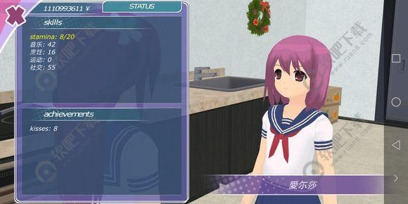 3、其中下面的位置可以看到有个kiss的选项,这是玩家与女友kiss的次数,每天可以与女友kiss一次,如果当日没有kiss在睡觉的时候会提示玩家。