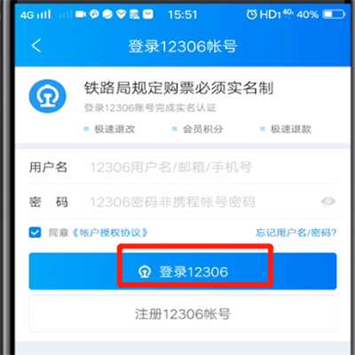 3.点击12306账号去登录,输入用户名和密码,点击登录12306即可