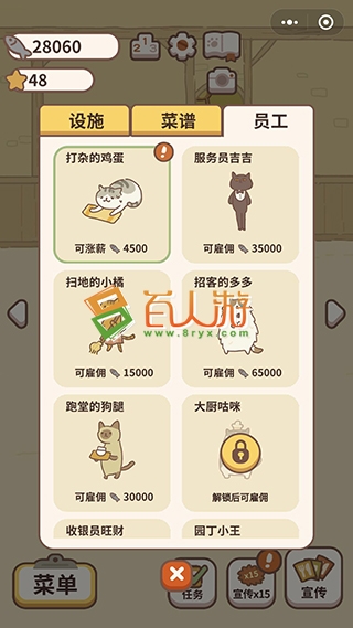 AM0XZZ。玩家们可以关注游戏的制作公司公众号,也许会有惊喜不断放出,当然也是官方作为一种回馈玩家的福利。多样的游戏模式选择,海量食谱菜单等你解锁,制作完美食物。解锁更多成就,宣传次数,解锁设施,解锁菜谱,解锁顾客数量都可以获得奖励。享受属于你的时间,陶醉在餐厅的世界里,你将体验到不一样的欢乐。