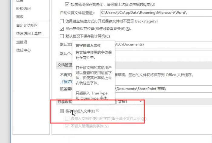 找到【将字体嵌入文件】选项,将其勾选,点击确定,